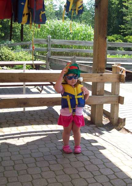 Only in Cottage Country, the tourist region known as the Muskokas in Northern Ontario, would you find a kid in an elf hat and a life jacket. This look says, 'I love Christmas, and boating'. There's a little theme park a couple hours from my hometown called Santa's Village - there are only about a dozen mostly lame rides, a few food vendors, and some prize stands. But there's also Santa, and his 'summer sleigh', this crazy boat that does 360s in the water, and you know what, that amount of rides is perfect for this age group. And they have reindeer! She freaking loved it.