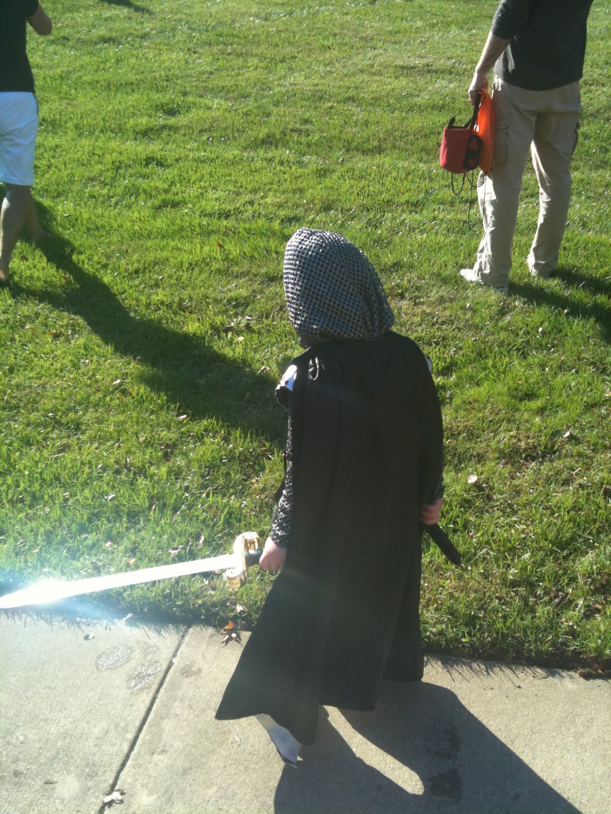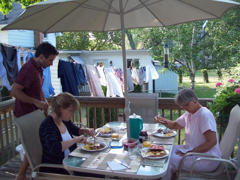 I like this picture because it sums us up nicely - there's my sister's bra hanging right there, and my mum is outside in plain view of several neighbors in her bathrobe, and we're missing half the people because they're running around doing other stuff. But there's a great breakfast on the table, and eventually we'll all be seated eating together, and the kids are now at their own table on the deck below hollering at us. And it's a beautiful day! Look, my sister is even wearing a sweater! Seriously, sooooo ready for cooler weather...